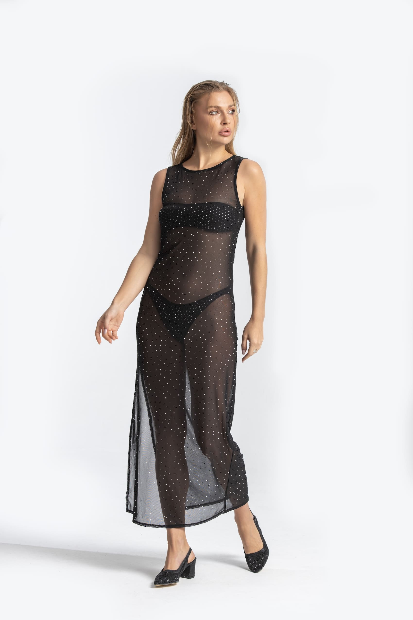 Zarif tül dokusu ve göz alıcı taş detaylarıyla öne çıkan taşlı uzun tül beach elbise, şeffaf yapısı ve maxi kesimiyle plaj lüks estetiğini mükemmel biçimde yansıtır. Özel boncuk ve taş süslemeleri, her harekette ışığı yakalayarak sofistike bir görünüm sunar.